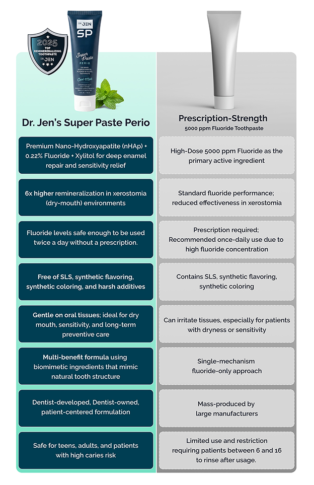 In a Pilot Study conducted in December 2023, Dr. Jen’s Super Paste (10% nHAp, .22% fluoride, and xylitol) was tested againsta high-prescription fluoride toothpaste containing 5000 ppm.Dr. Jen’s Super Paste outperformed high-prescription toothpaste