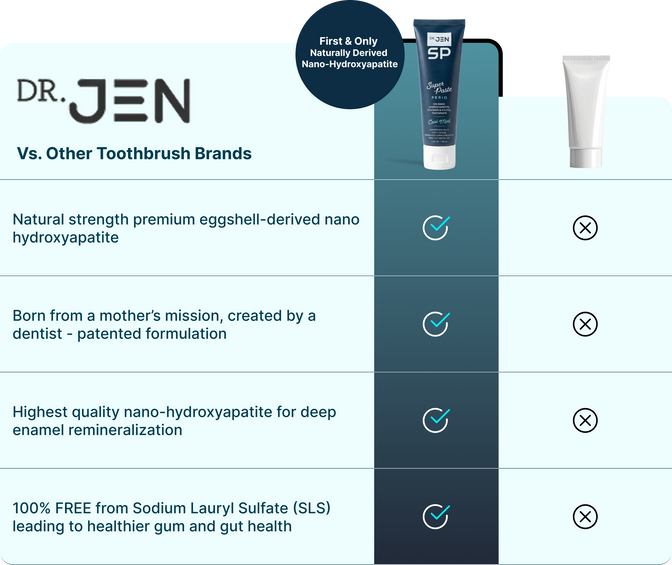 "Dr Jen's Super Paste is made by a real dentist using two proven ingredients to remineralize tooth enamel. It is natural, tastes great, and is gentle on teeth and gums."