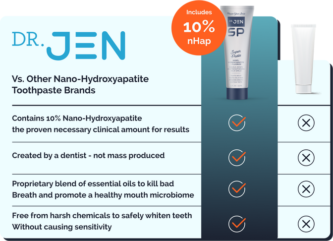 Dr. Jen Super Paste combines super ingredients 10% Nano-Hydroxyapatite and Fluoride which is clinically proven to outperform fluoride alone toothpaste.